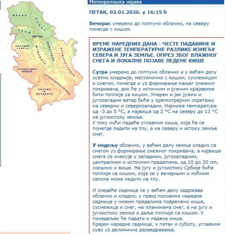 ВРЕМЕ НАРЕДНИХ ДАНА - ЧЕСТЕ ПАДАВИНЕ И ИЗРАЖЕНЕ ТЕМПЕРАТУРНЕ РАЗЛИКЕ ИЗМЕЂУ СЕВЕРА И ЈУГА ЗЕМЉЕ. ОПРЕЗ ЗБОГ ВЛАЖНОГ СНЕГА И ЛОКАЛНЕ ПОЈАВЕ ЛЕДЕНЕ КИШЕ