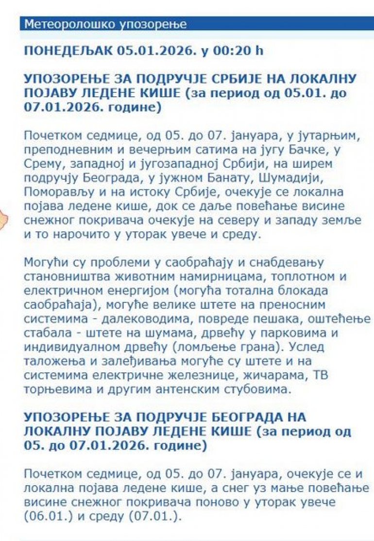 "Могући су проблеми у саобраћају и снабдевању становништва животним намирницама, топлотном и електричном енергијом (могућа тотална блокада саобраћаја), могуће велике штете на преносним системима – далеководима, повреде пешака, оштећење стабала – штете на шумама, дрвећу у парковима и индивидуалном дрвећу (ломљење грана). Услед залеђавања могуће су штете и на системима електричне железнице, жичарама, ТВ торњевима и другим антенским стубовима. Упозорење на подручју Београда на локалну појаву ледене кише, Почетком седмице, од 05. до 07. јануара, очекује се и локална појава ледене кише, а снег уз мање повећање висине снежног покривача поново у уторак увече (06.01.) и среду (07.01.)", стоји у саопштењу.