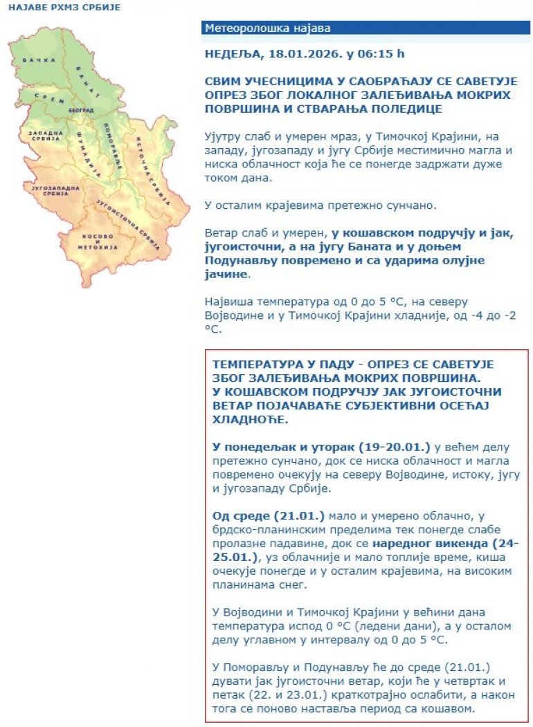У јутарњим сатима очекује се слаб до умерен мраз, а у Тимочкој крајини, као и на западу, југозападу и југу Србије, местимично ће бити магле и ниске облачности, која се понегде може задржати и током дана. У осталим крајевима преовлађиваће сунчано време.