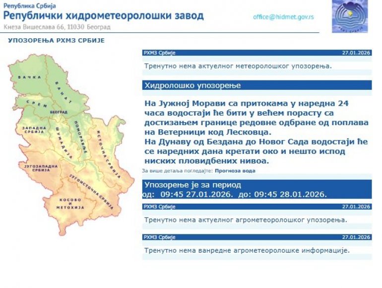 Поред прогнозе, РХМЗ је упозорио и на пораст водостаја на Јужној Морави.
