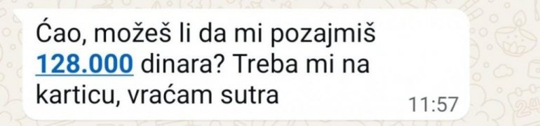 Порука углавном гласи: "Ћао, можеш ли да ми позајмиш 120.000 динара? Треба ми на картицу, враћам сутра".