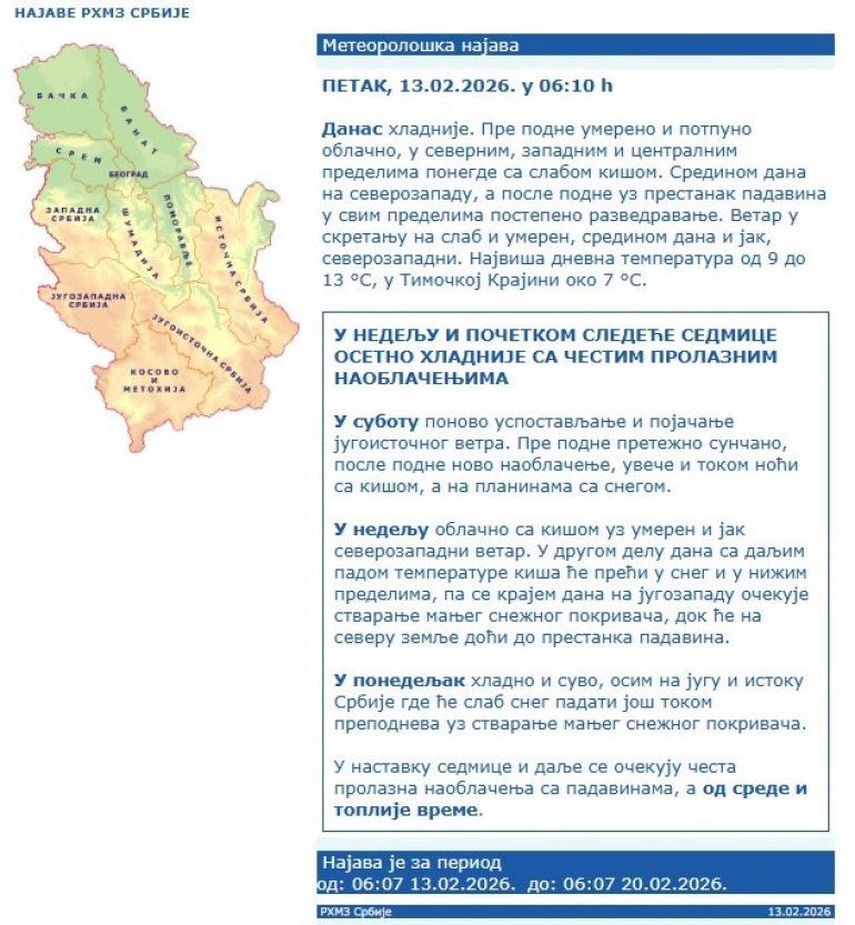 У Србији у петак пролазно наоблачење са кишом, на вишим планинама са снегом. На северу Војводине суво, током дана и претежно сунчано. Према крају дана у свим пределима разведравање. Дуваће северозападни ветар. Јутарња температура од 3 до 7°Ц, на истоку Србије до 1°Ц, максимална дневна од 8 до 14 степени.