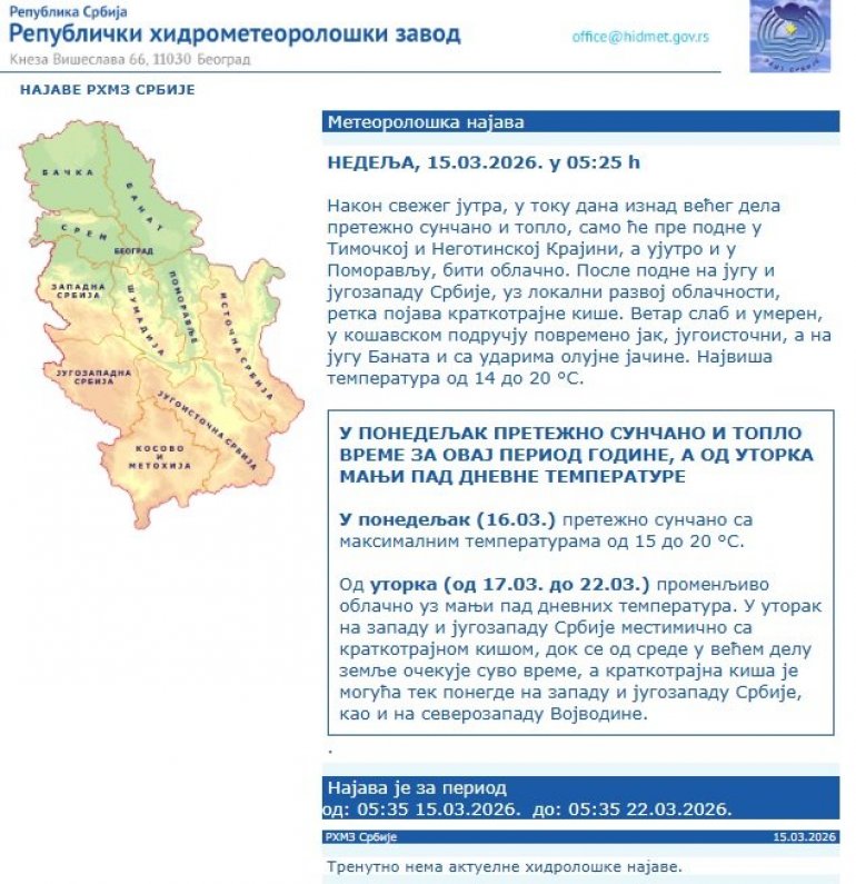 У понедељак (16.03.) претежно сунчано са максималним температурама од 15 до 20 °С.