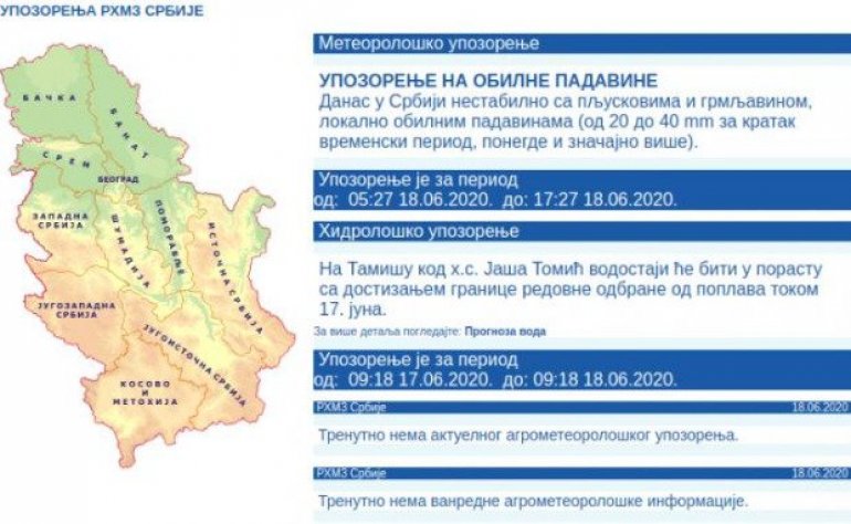 ДО ПЕТКА ће у Србији бити променљиво време са пљусковима и грмљавином, локално са обилним падавинама од 20 до 40 мм за кратак временски период, а понегде и значајно више.