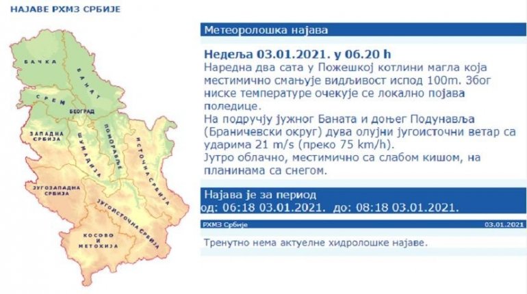 РЕПУБЛИЧКИ хидрометеоролошки завод (РХМЗ) издао је јутрос најаву у којој упозорава да је у Пожешкој котлини могућа магла која местимично смањује видљивост испод 100 метара, те да се због ниске температуре очекује локално појава поледице.