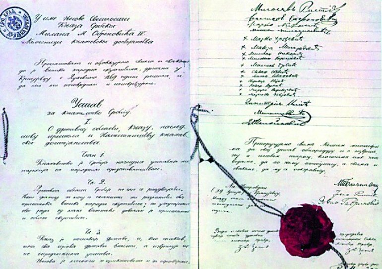 А на Сретење 1835. Кнежевина Србија на Скупштини у Крагујевцу добила је свој први Устав. Према одређеним стручним мишљењима, нема важнијег од овог датума у новијој српској историји, јер означава почетак борбе за ослобођење од турске власти, с једне, уставно уређење и поновно ступање српске државе на европску политичку сцену. Дакле, овај датум и овај празник у себи садржи две битне компоненте српског народа и његове државе, ослободилачку и слободарску, спајајући те две традиције у једну. Ослободилачку да не трпи туђинску власт, а слободарску када има и сопствену власт у рукама народ наставља да се бори за своју политичку слободу, демократију, а против ауторитета вође и свих врста ауторитарности и самовоље.