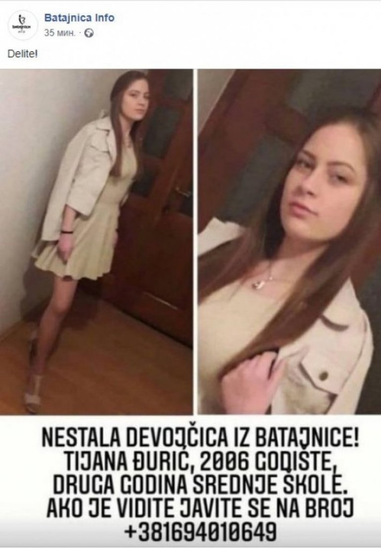 - Нестала девојчица из Батајнице. Тијана Ђурић, 2006. годиште. Друга година средње школе. Ако је видите јавите - стоји у објави.