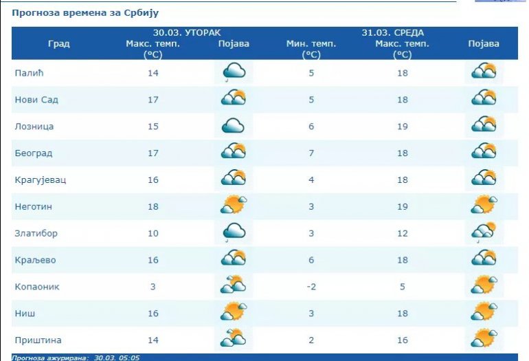 Најнижа температура од један до осам степени, а највиша од 14 до 18.
