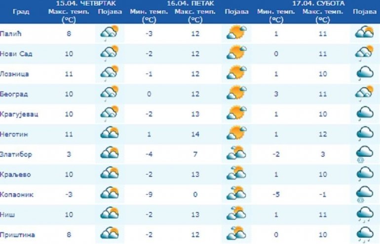 Ветар слаб, променљивог смера. Најнижа температура од -3 до 1, највиша од 11 до 14 степени, саопштио је Републички хидрометеоролошки завод.