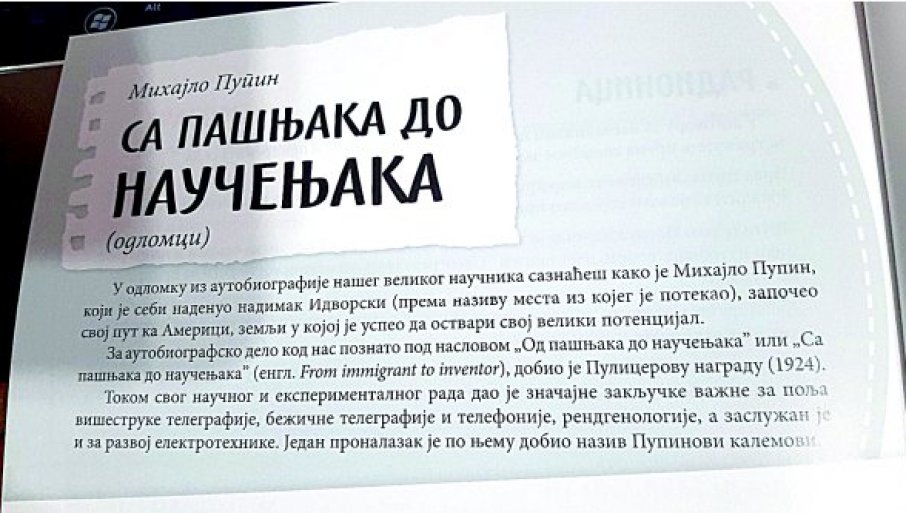 У ПРОГРАМУ за седми разред предвиђен је одломак из биографије Михаила Пупина "Са пашњака до научењака", за коју је он добио Пулицерову награду. У читанкама нису одабрани делови о Светом Сави, иако је Пупин истицао њихов значај.