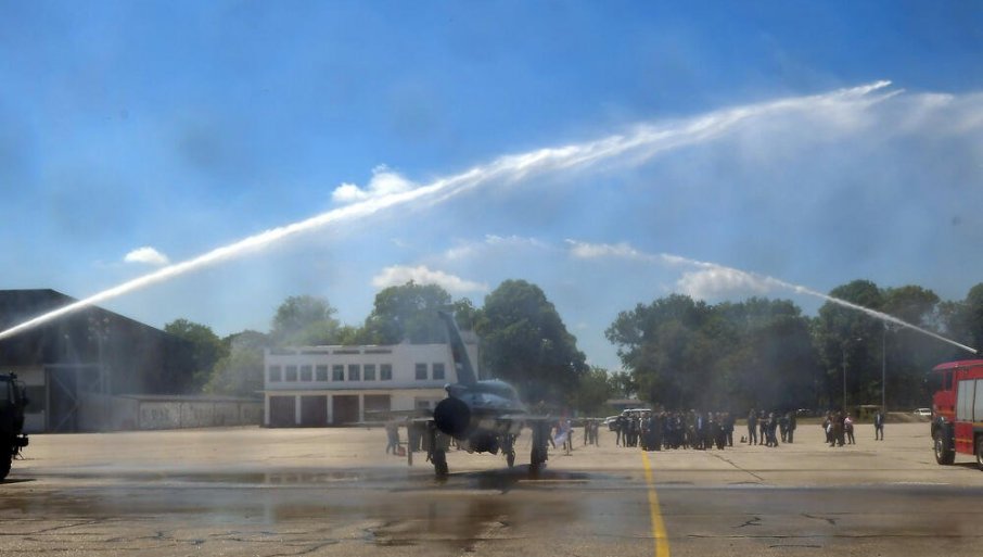 Легендарни авион МиГ-21 сиболично је поздрављен традиционалним воденим славолуком у част дугогодишње службе у нашој војној авијацији.