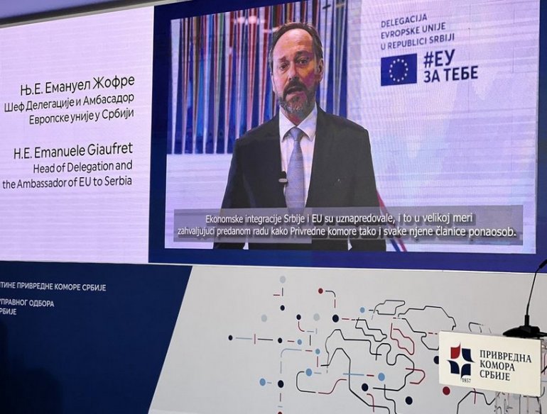 Економске интеграције Србије и ЕУ узнапредовале су у великој мери захваљујући преданом раду како ПКС, тако и сваке њене чланице. Више од једне деценије ЕУ је далеко најважнији трговински партнер Србији, која је из дана у дан све ближа унутрашњем тржишту ЕУ, рекао је Емануел Жиофре, шеф Делегације ЕУ у Србији, у видео обраћању.