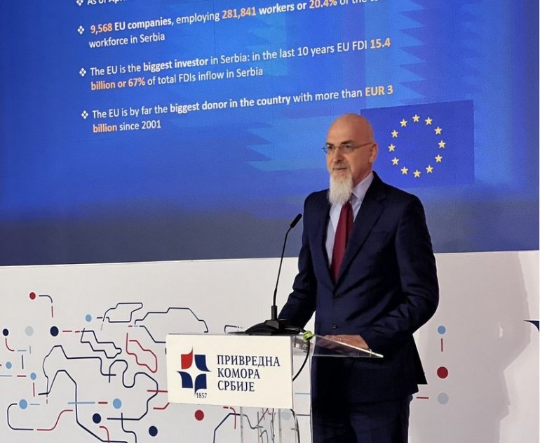 Српски приватни сектор, по његовим речима, један је од најјачих поборника европских економских интеграција Србије, а о сарадњи бројке говоре саме за себе. Прошле године извоз Србије у ЕУ износио је 64 одсто укупног извоза, док је билатерална трговина достигла скоро 40 милијарди евра. Инвестиције из Уније чине око 60 одсто укупних СДИ у Србији, а процењује се да компаније из ЕУ запошљавају између 280.000 и 300.000 људи директно, а индиректно много више, објашњава Жиофре. Подсећа на нови план Европске комисије за унапређење процеса интеграције Западног Балкана који почива на четири стуба - приближити Западни Балкан јединственом тржишту ЕУ, продубити регионалне економске интеграције, убрзати основне реформе и повећати претприступне фондове.