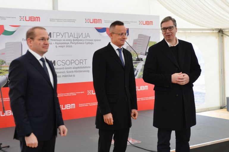 ПРЕДСЕДНИК Србије Александар Вучић и министар спољних послова и трговине Мађарске Петер Сијарто положили су камен темељац за изградњу фабрике сточне хране УБМ групације у Адашевцима.
