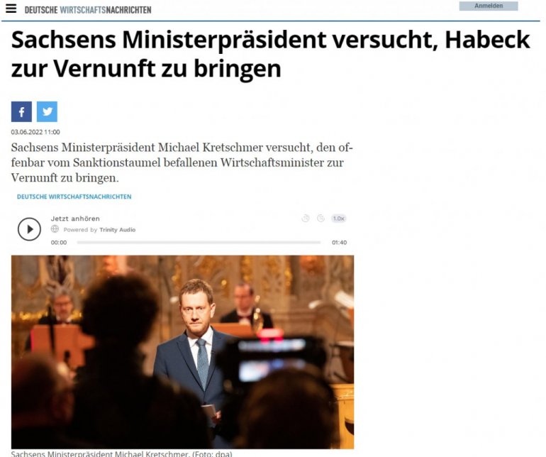 САКСОНСКИ премијер Михаел Кречмер осудио је исхитрене планове Берлина да заустави увоз руског угља, гаса и нафте, пише "Дојче Виртшафтс Нахрихтен", преносе РИА Новости.