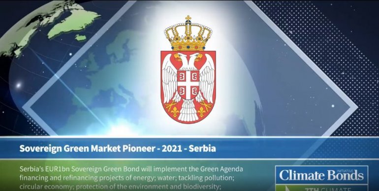 - Ако се награде и признања добијају у условима опште неизвесности и економске кризе, то само показује да је држава одрадила добар посао и да одговорно води своје грађане путем напретка. Србија, као водећа земља региона, жели да послужи као пример другима у окружењу. Желимо да будемо предводници у спровођењу Зелене агенде и да свет препозна ту нашу намеру и визију. Посвећени смо улагању у екологију и заштиту животне средине и обезбеђивању финансирања зелених пројеката из нових извора финансирања као што је веома актуелно тржиште зелених обвезница - рекао је министар финансија Синиша Мали.