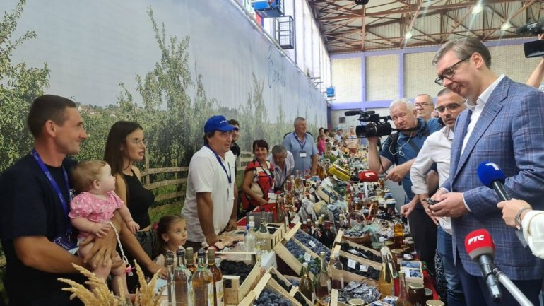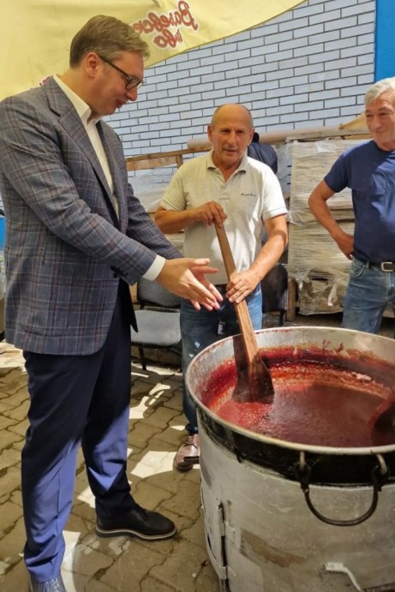 Председник Вучић је по доласку разговарао са сељацима и излагачима, и посебно се интересовао за прављење џема од шљива.