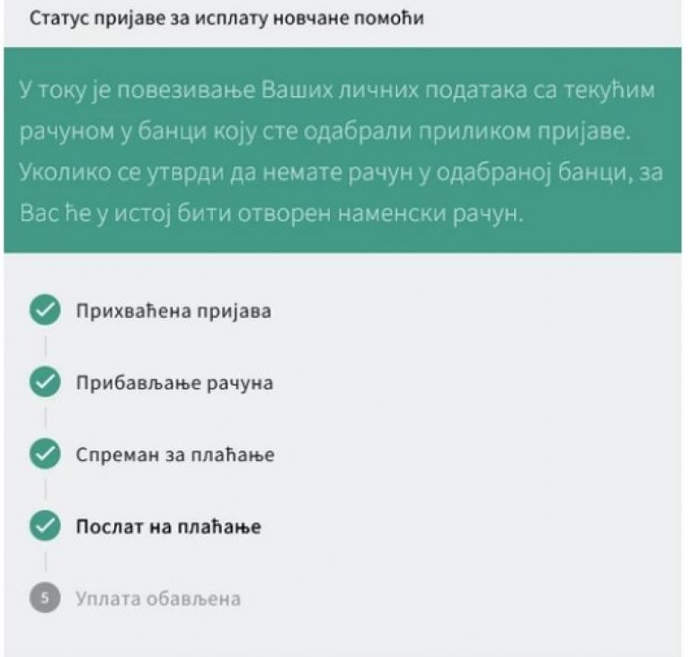 Након уноса података у образац, појавиће вам се информације о статусу пријаве за исплату новчане помоћи. Уколико је новац легао на ваш рачун, последња ставка биће штиклирана "Уплата обављена".