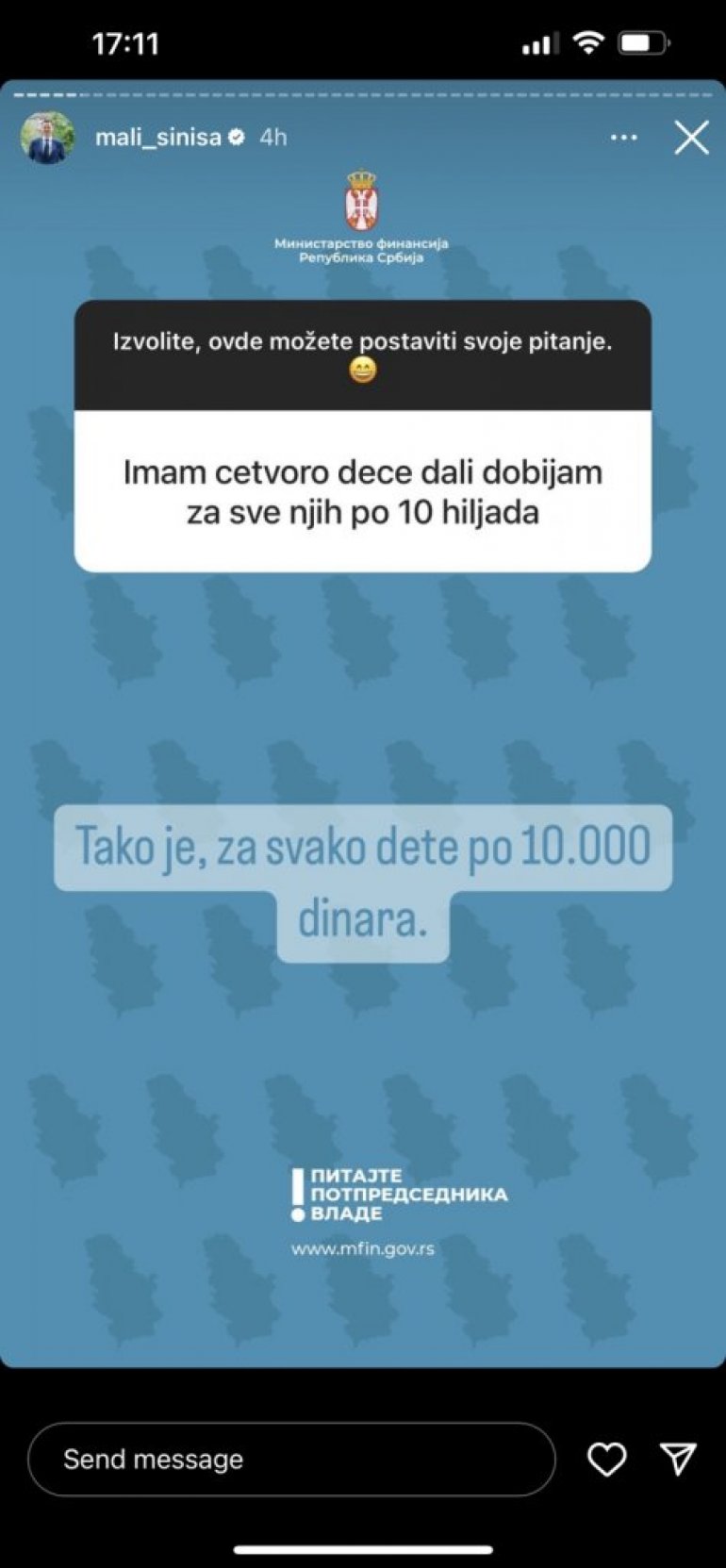 МАЈКА четворо деце поставила је питање министру финансија Синиши Малом о помоћи државе од 10.000 динара за децу.