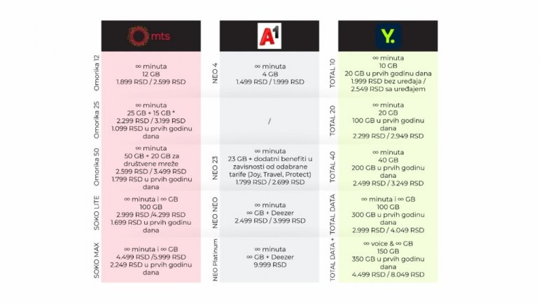 Наиме, у почетном сегменту пакета који подразумева неограничен број минута за разговор и смс порука ка свим мрежама, најјефтинију понуду има А1 који за утрошених 1.499 динара месечно, кроз свој НЕО 4 пакет, корисницима нуди 4 гигабајта интернета. мтс у свом Оморика 12 пакету нуди 12 ГБ интернета за 1.899 динара месечно, док Yеттел у Тотал 10 пакету, за 1.999 динара, месечно уместо досадашњих 10 ГБ, нуди 20 ГБ за првих годину дана уговорне обавезе, и то уколико се за овај пакет одлучите током летње промоције.
