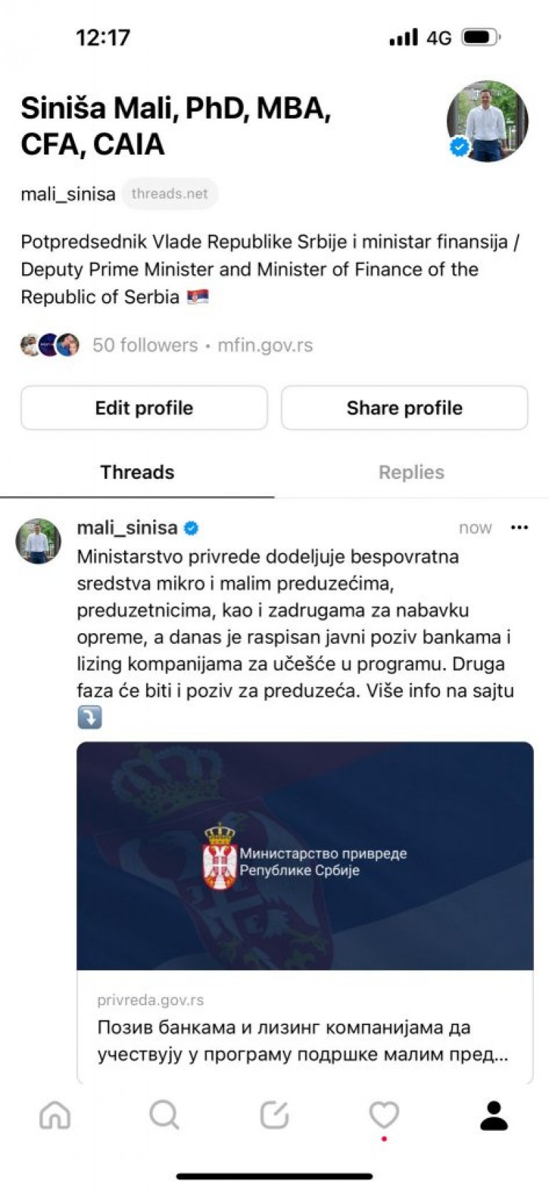 ПРОГРАМ ПОДРШКЕ МАЛИМ ПРЕДУЗЕЋИМА: Министар Мали се огласио на новој мрежи Threads поводом јавног позива Министарства привреде
