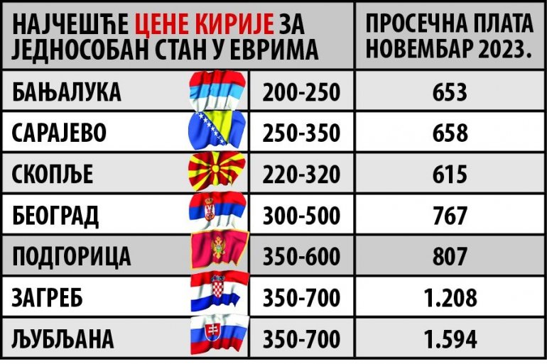 КИРИЈЕ за станове у великим градовима у региону отишле су у небо, јављају дописници "Новости". За грађане са просечним примањима изнајмљивање нектретнине је постало прави луксуз, а многе који зарађују испод просека поскупљење ренте је довело на руб егзистенције. Поређење ренте за једнособан стан, показује да најмање на месечном нивоу плаћају подстанари у Бањалуци, од 200 до 250 евра, и Скопљу где је потребно издвојити од 220 до 320 евра. Највећа цена најма за некретнину исте структуре је у Подгорици, Загребу и Љубљани, а креће се од 350 до 700 евра. Београд је негде између ове две категорије, закуп једнособних станова углавном иде од 300 до 500 евра.