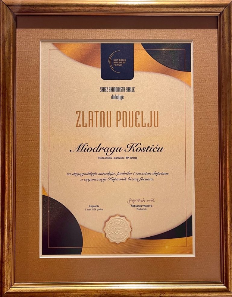 У ПРИСУСТВУ великог броја представника српске и регионалне бизнис заједнице на отварању XXXI Копаоник бизнис форума, Савез економиста Србије доделио је Златну повељу Миодрагу Костићу, председнику и оснивачу компаније MK Group.
