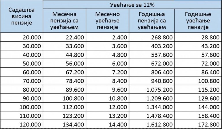 - Пензија од 100.000 динара биће увећана за 12.000 динара и износиће 112.000 динара месечно. На годишњем нивоу то је 1.344.000 динара, односно 144.000 динара више.