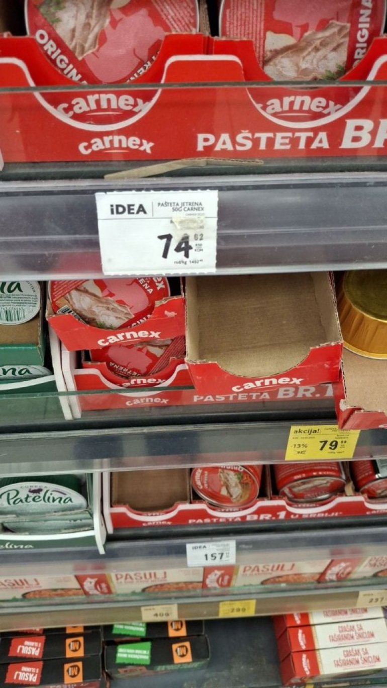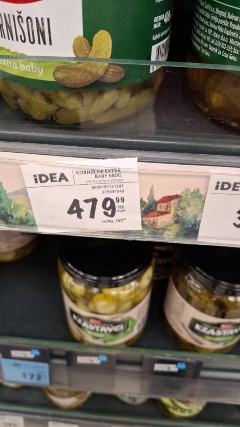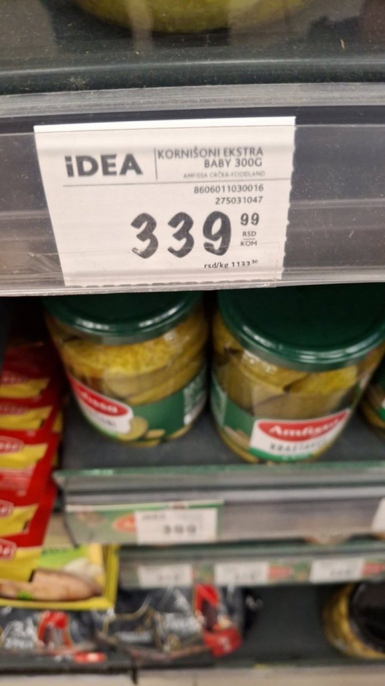 Корнишони од 680г су коштали 479 док сада коштају 419, а корнишони 300г који су коштали 339 сада коштају 257; овсена каша је коштала 99 док сада кошта 85, паштета 150г је коштала 184 док сада кошта 157, паштета 50г је коштала 77 а сада кошта 74, микс пасуљ и кукуруз је коштао 419 а сада кошта 312.