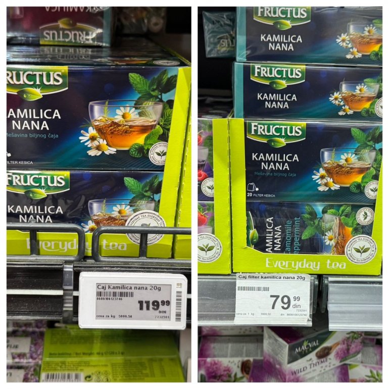 Чај од камилице пре појефтињења био је 119, док је сада 79 динара.