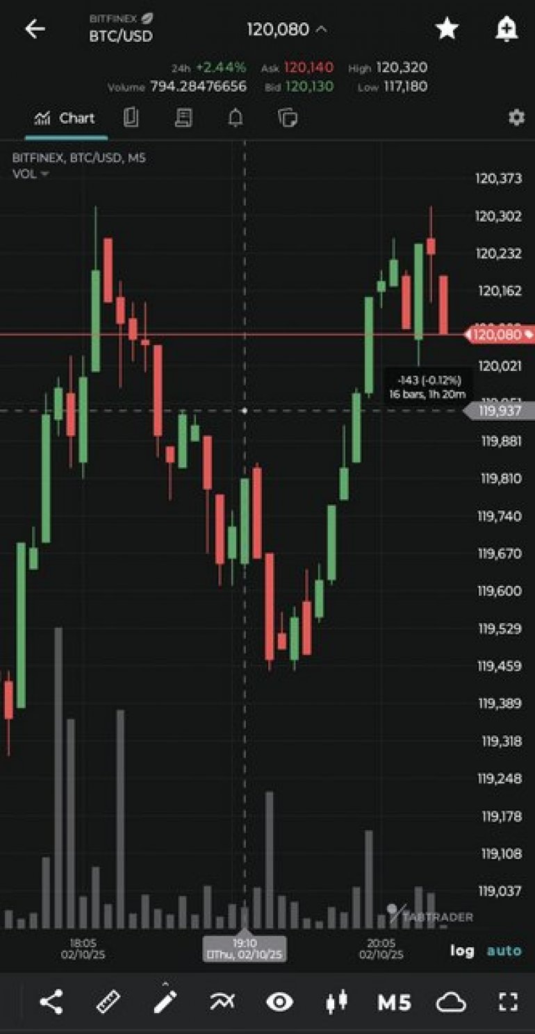НА ПОПУЛАРНОЈ берзи Bitfinex, у последњих неколико сати виђена је жестока борба, цене су се у кратком року подигле за више од 1.2%, а BTC се тренутно тргује на $120,080.