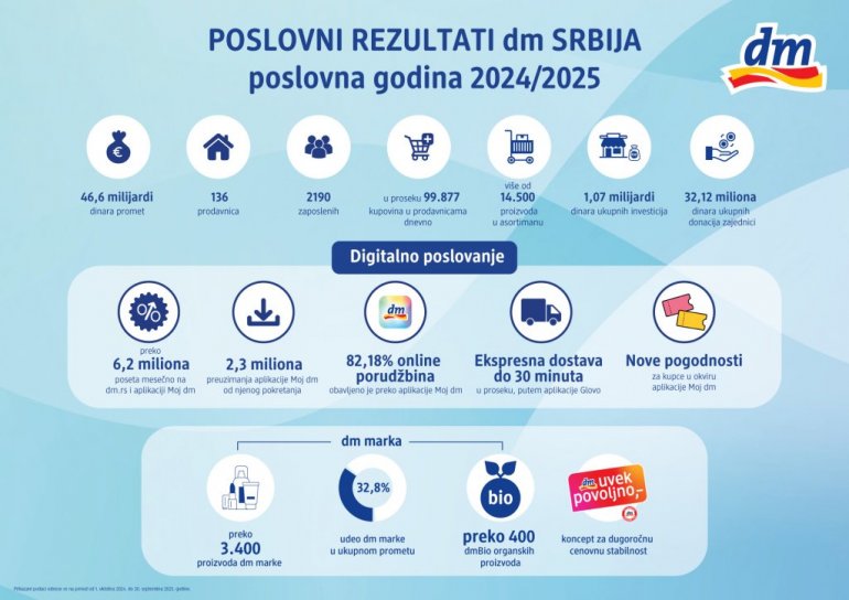 Уз укупан промет од 46,6 милијарди динара као и раст од 21,88 одсто, дм је додатно учврстио позицију међу водећим ланцима у Србији. Укупне инвестиције у протеклој години износиле су 1,07 милијарди динара, што сведочи о континуираном развоју продајне мреже, дигиталних сервиса и одрживог пословања.