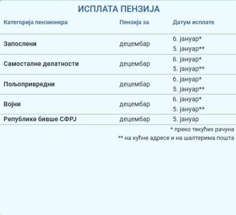 Корисницима из категорије запослених пензије ће бити исплаћене 5. јануара на шалтерима поште, док ће уплата на текуће рачуне бити извршена 6. јануара.