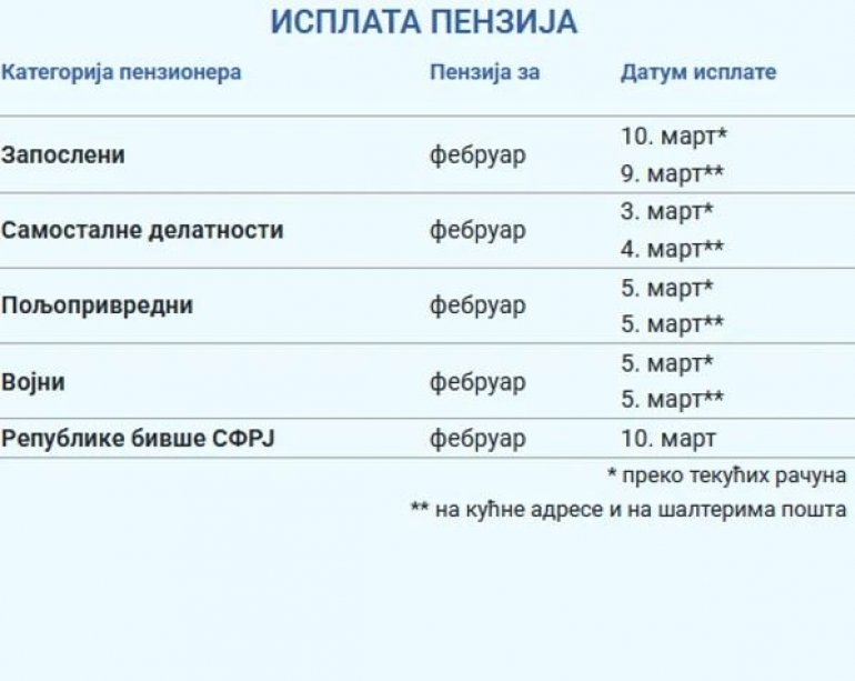 Пензионери из категорије запослени свој новац добијају 9. марта на кућне адресе и на шалтерима пошта, док ће 10. марта бити исплата преко текућих рачуна.