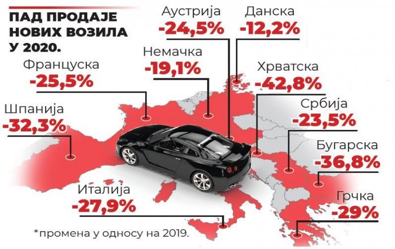 ПРОДАЈА нових путничких возила на српском тржишту лане је пала готово за четвртину у односу на 2019. годину. Сличан тренд је и у земљама Европске уније, а највећи минус бележе неки од наших суседа.