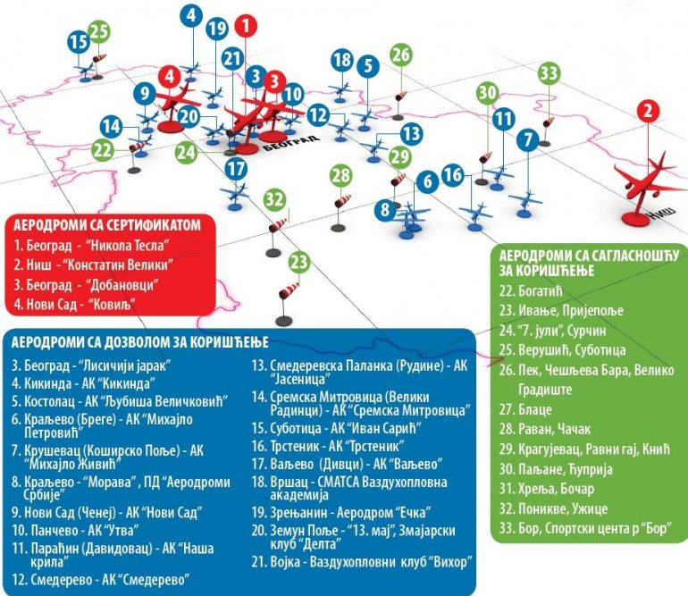 Србија тренутно има 33 аеродрома, а за међународни редовни јавни авио-превоз користе се само три - "Никола Тесла", "Константин Велики" и "Морава".