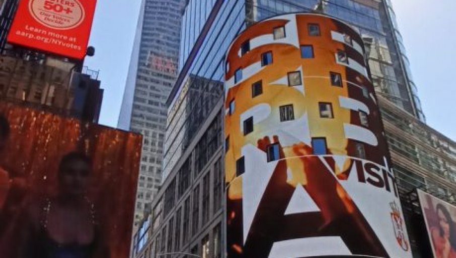 Тајм сквер познат је по великом броју огромниих бљештећих реклама постављених преко околних небодера, а на једној од њих од 10.15 по локалном времену приказује се реклама на којој се виде америчка и српска застава са поруком "Лонг ластинг фриендсхип" (дуго пријатељство).