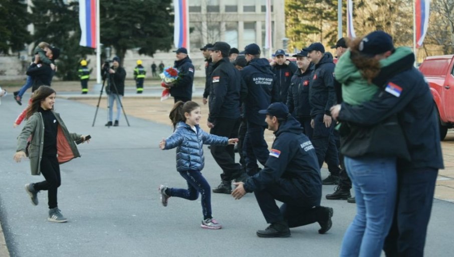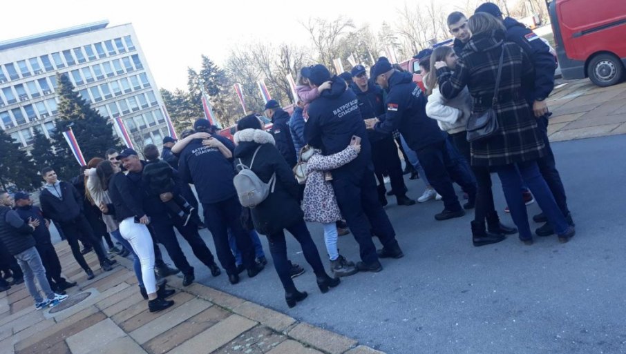 Породице ватрогасаца-спасилаца дочекале су своје вољене испред Палате Србија. Било је много загрљаја и суза.