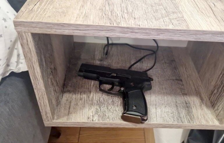 Он је, како се сумња, најпре од оца који је полицијски службеник из породичне куће украо службени пиштољ са мецима, опасач и лисице, што је отац одмах и пријавио.