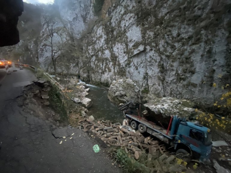 КАМИОН СЛЕТЕО У ПРОВАЛИЈУ У КАЊОНУ ЈЕРМЕ: Одрон на путу, возило крцато дрвима одлетело у бездан - возач имао невероватну срећу