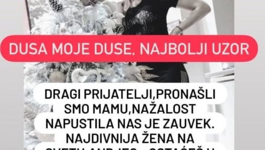 - Драги пријатељи, пронашли смо маму, нажалост напустила нас је заувек. Најдивнија жена на свету, анђео... Остаћеш у нашем срцу заувек највољенија, најмилија мајко моја.