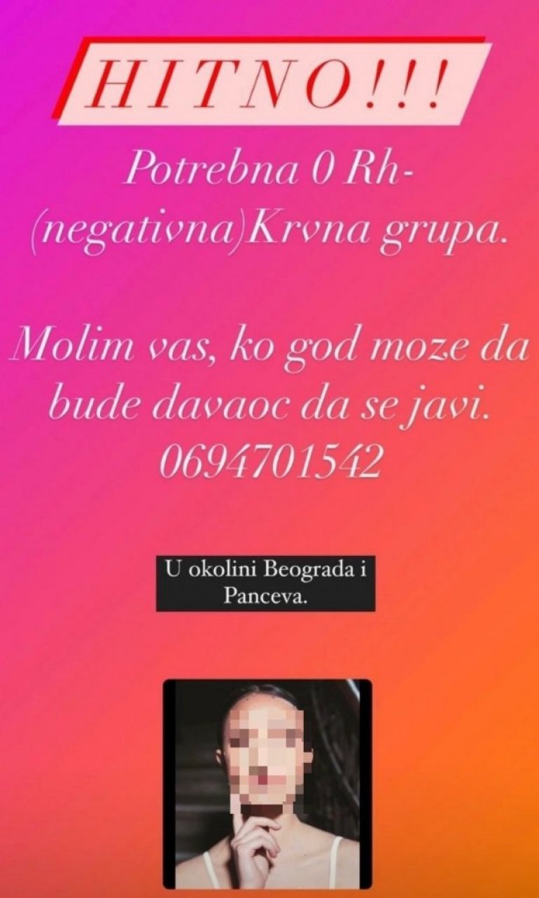 - Молимо за помоћ за једну младу девојку Анастасију Јоцев из Алибунара, која је недавно завршила средњу балетску школу, доживела је саобраћајну несрећу и тешко је повређена. Можете дати крв у понедељак у Институту за трансфузију крви Нови Сад у Новом Саду 07-19х - наводи се на друштвеним мрежама.
