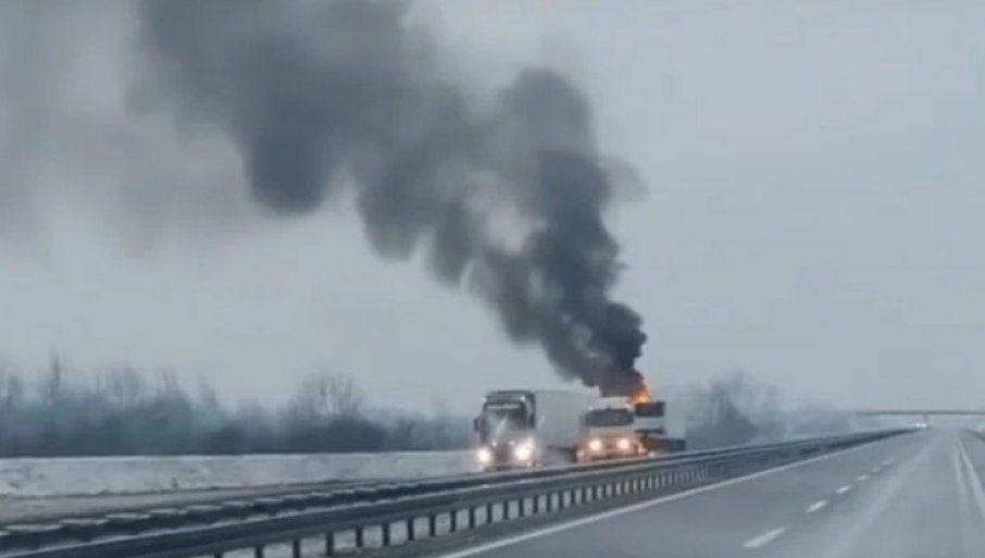 Оно што се може видети на снимку је црни густи дим и ватра која је захватила камион.