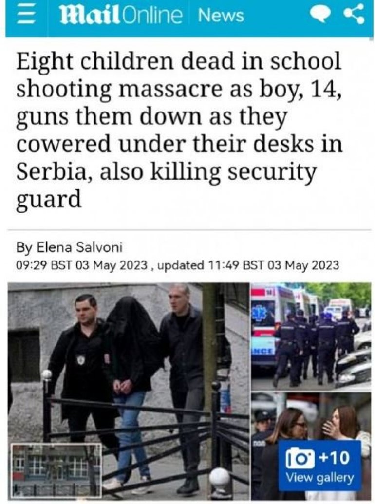 Оно што се данас догодило на насловним странама је свих светских портала. Тако британски Дејли мејл преноси да је осморо деце, као и радник обезбеђења, настрадало у дивљању 14-годишњег дечака, који је наоружан улетео у учионицу где се одржавао час историје.