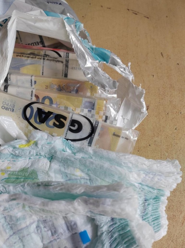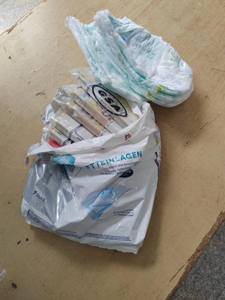 Убрзо је утврђено да се међу пеленама налази кеса са 130.000 евра, као и коверат са 5.500 долара.
