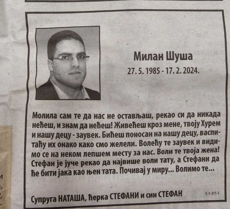 МИЛАН Шуша (39) убијен је 17. фебруара, нешто после 10 сати, на углу Кумановске и Улице Ђоке Ковачевића, а породица је данас објавила читуљу и опростила се од њега потресном поруком.