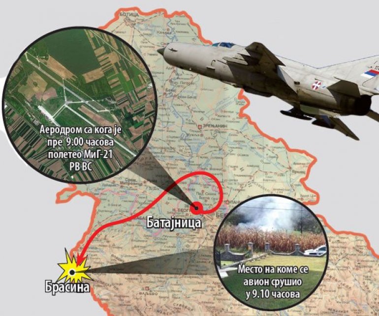 Пад војног "мига 21" свега који тренутак по несрећи регистрован је у Оперативном центру РВ и ПВО, а на место удеса упутили су се хеликоптери Службе за трагање и спасавање МУП Србије. У Брасину су слетели и војни хеликоптери, који су трагали за пилотима.
