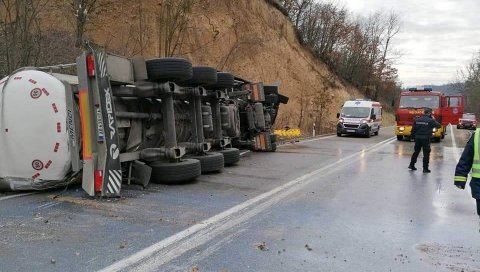 НЕСРЕЋА КОД ЗАЈЕЧАРА: Преврнула се цистерна - повређени возач и сувозач (ФОТО)