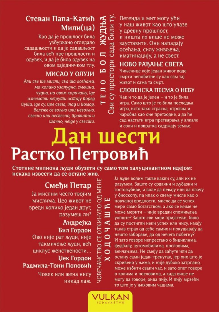 Последње године живота Растко Петровић проводи у Сједињеним Америчким Државама, најпре у дипломатској служби а потом, по окончању Другог светског рата, као емигрант и слободни уметник, усамљеник који жуди за повратком у отаџбину. То је време када настаје Растково завршно, монументално дело, сума његовог животног и уметничког искуства, роман Дан шести. То остварење интензивно комуницира са целином књижевног, историјског, научног и идеолошког искуства у времену у коме је настајао - од авангардних поступака монтаже и симултанизма, Џојсовог тока свести и Ајнштајнове теорије релативитета, Фројдове и Јунгове психоанализе. Коначно, први део Дана шестог један је наших најбољих романа о Првом светском рату који је трагичним дешавањима националне историје дао свевременски смисао.