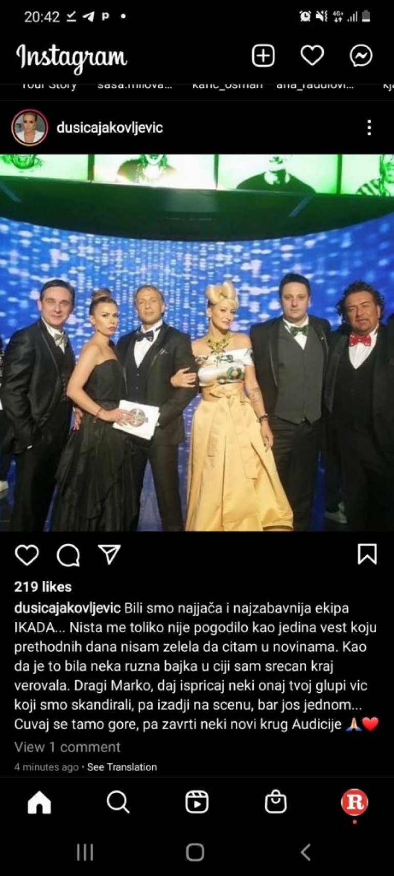 - Били смо најјача и најзабавнија екипа икада... Ништа ме толико није погодило као једина вест коју претходних дана нисам желела да читам у новинама. Као да је то била нека ружна бајка у чији сам срећан крај веровала. Драги Марко, дај испричај неки онај твој глупи виц који смо скандирали, па изађи на сцену, бар још једном... Чувај се тамо горе, па заврти неки нови круг Аудиције - написала је водитељка Душица.